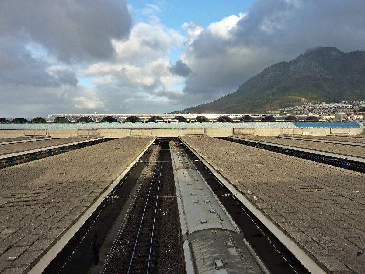 Üder den insgesamt 24 Gleise des Bahnhofs Kapstadt befindet sich eine Markt sowie eine Minibusstation. rechts im Bild ist der berühmte Tafelberg. Aufgenommen am 26.07.2014
