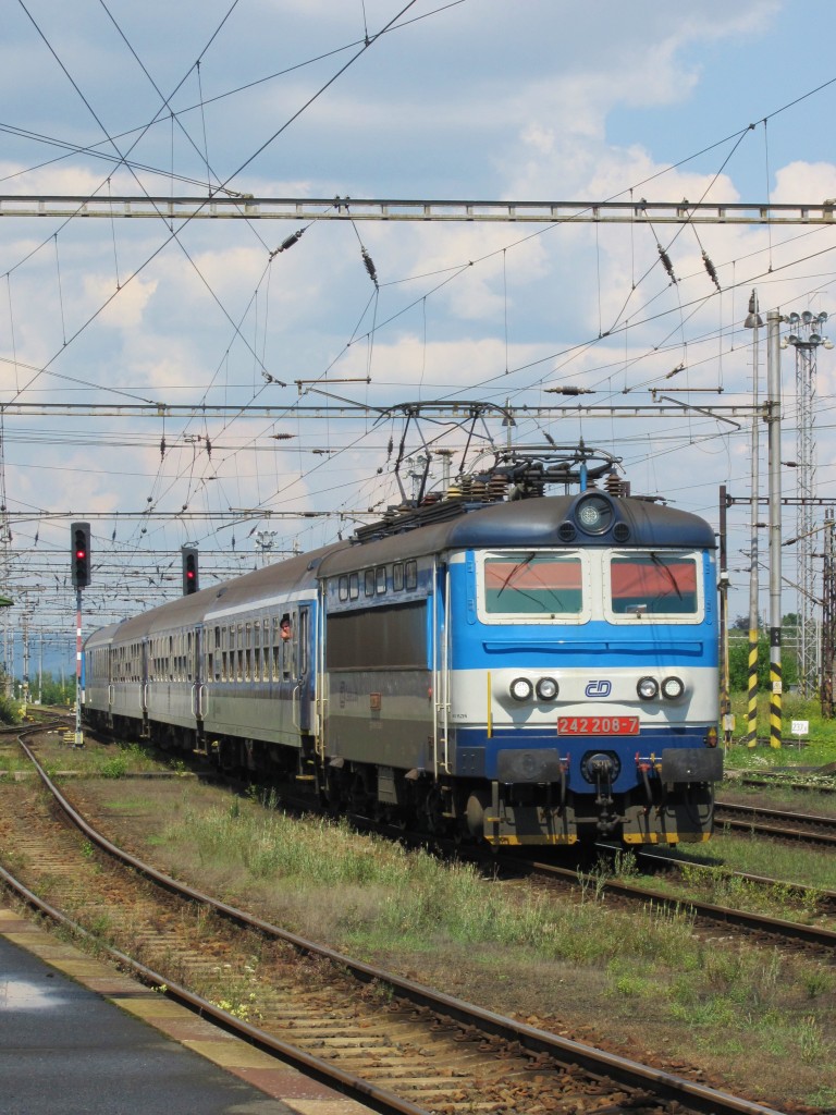 Zum 400. Bild gibt es eine ganz besonders lackierte Lok! 23.7.2014 14:14 ČD 242 208-7 mit einem Schnellzug (R) aus Praha hl.n. bei der Einfahrt in den Zielbahnhof Cheb.