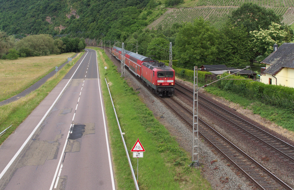 143 925 fährt auf der Saarstrecke zwischen Wiltingen und Schoden. Nach dem Fahrplanwechsel Dezember 2014 sollen die 143er in der Region Saarbrücken - Trier verschwunden sein. Regionalexpress Koblenz - Saarbrücken - Bahnstrecke 3230 Saarbrücken - Karthaus am 15.06.2014
