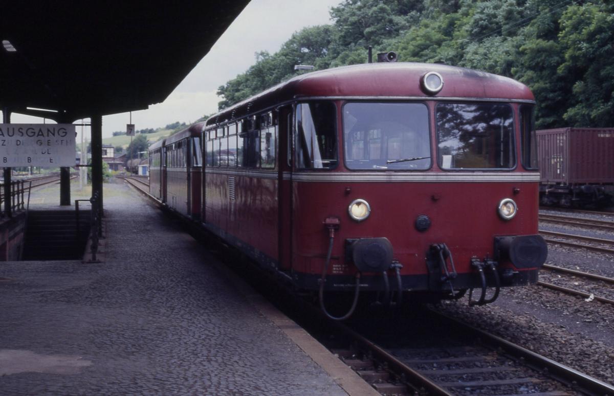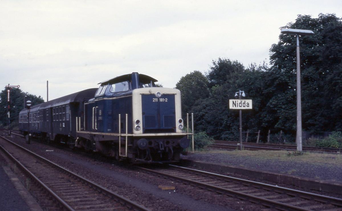 211191 mit Nahverkehrszug nach Gelnhausen in Nidda einfahrend am 17.7.1987 um 15.38 Uhr.