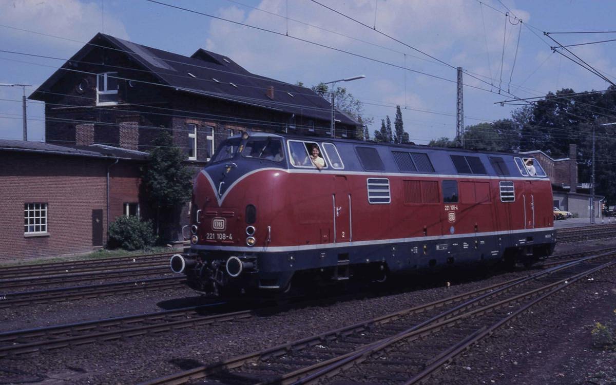 221198 führt am 4.7.1987 anläßlich "140 Jahre Cöln Mindener Eisenbahn" Führerstandsmitfahrten im Bahnhof Minden durch.