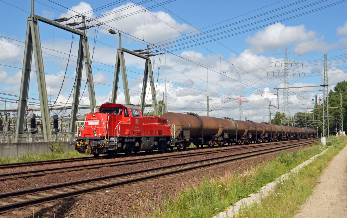 261 029 zog am 02.07.14 mit einem Kesselwagenzug am Umspannwerk Dradenau vorbei Richtung Altenwerder.