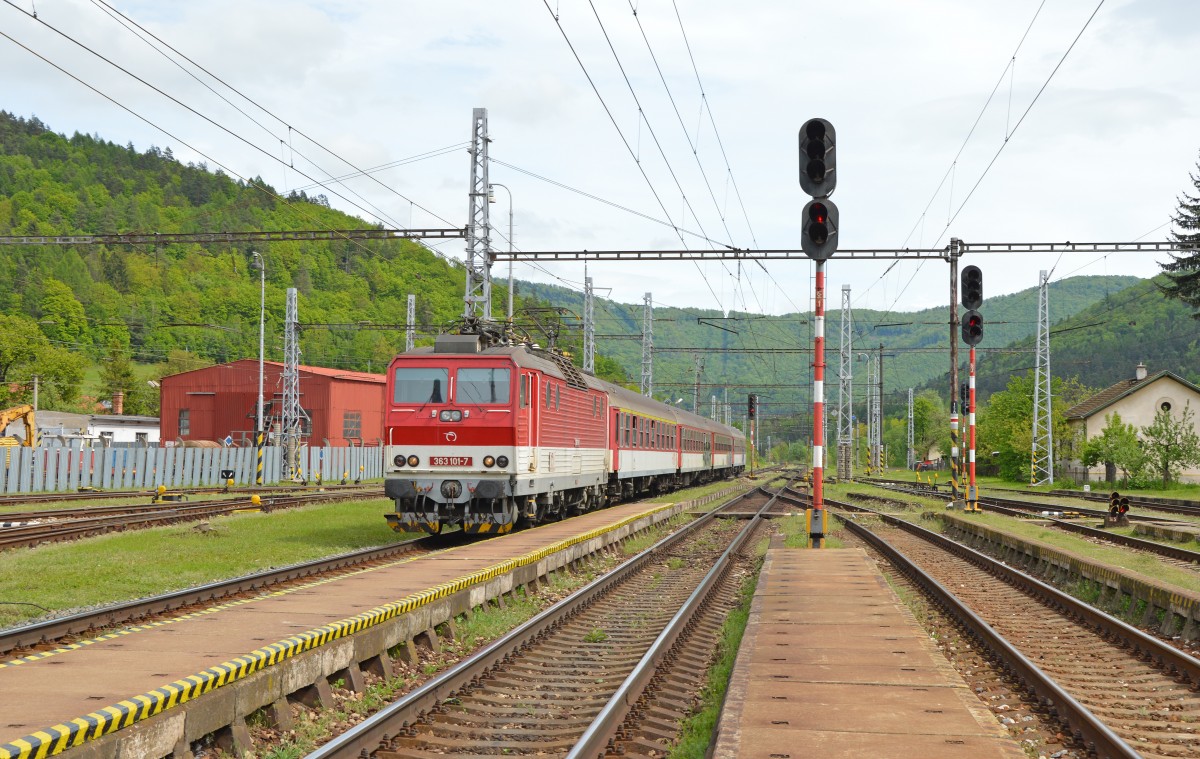 363 101-7 fährt mit Regionalzug Os 7812 Košice/Kaschau (13:27) – Poprad-Tatry/Deutschendorf (15:18) in Knotenbahnhof Margecany/Margareten (Kreis Göllnitz) ein; 11.05.2014