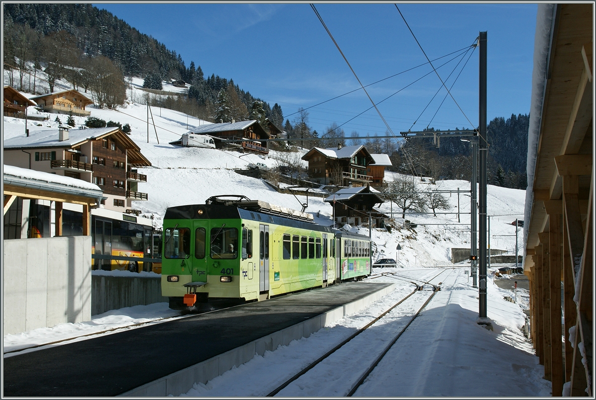 Der ASD BDe 4/4 erreicht den "neuen" Bahnhof von Le Sépey, welcher sich überraschend geschmackvoll zeigt. 25. Jan. 2014