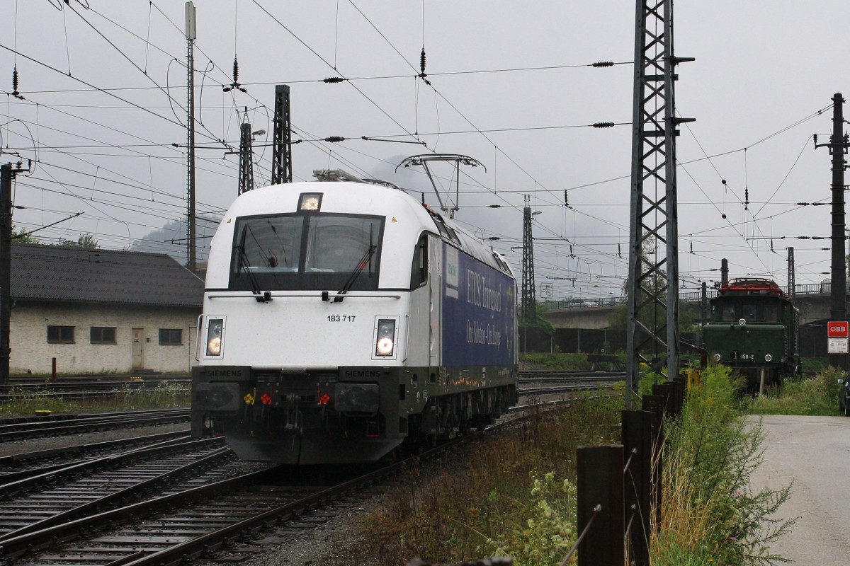 Ein schönes Geburtstagsgeschenk für mich, leider hat das Wetter gar nicht mitgespielt. Die 183 717-8 PCW (ETCS-Trainguard, One Solution-One Europe) von Siemens ist am 31.7.2014 zu besuch in Kufstein. Es werden Testfahrten durch das Tiroler Unterland durchgeführt. Nach kurzem Aufenthalt ging es zurück auf die Strecke mit einem Leerzug. Nebenan abgestellt ist das Krokodil 194 158-2 von Rail4U. Alt trifft Neu :-)