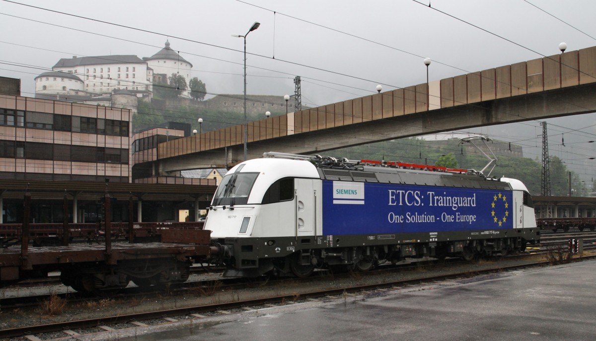 (ETCS:Trainguard, One Solution-One Europe). Im Hintergrund die Festung Kufstein im Regen.
