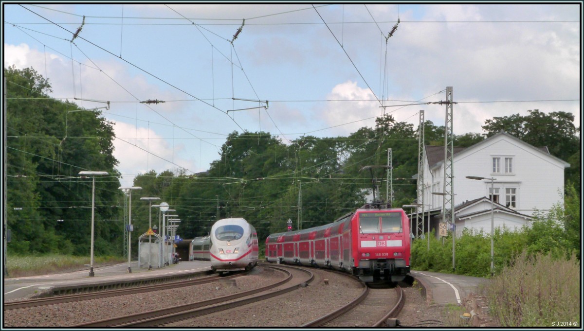 Reger Bahnverkehr am Bahnhof von Eschweiler (Rhl),am 30.Juli.2014. Während der NRW Express aud das Abfahrtssignal wartet,legt sich der ICE 3 aus Brüssel elegant in den Gleisbogen.