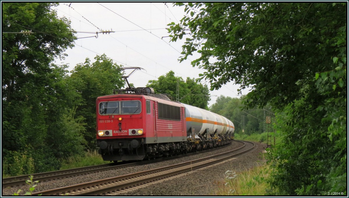 Unterwegs auf der Kbs 485 bei Rimburg. Die 155 038-3 mit einen Kesselwagenzug am Haken.Szenario vom 4.Juli 2014.