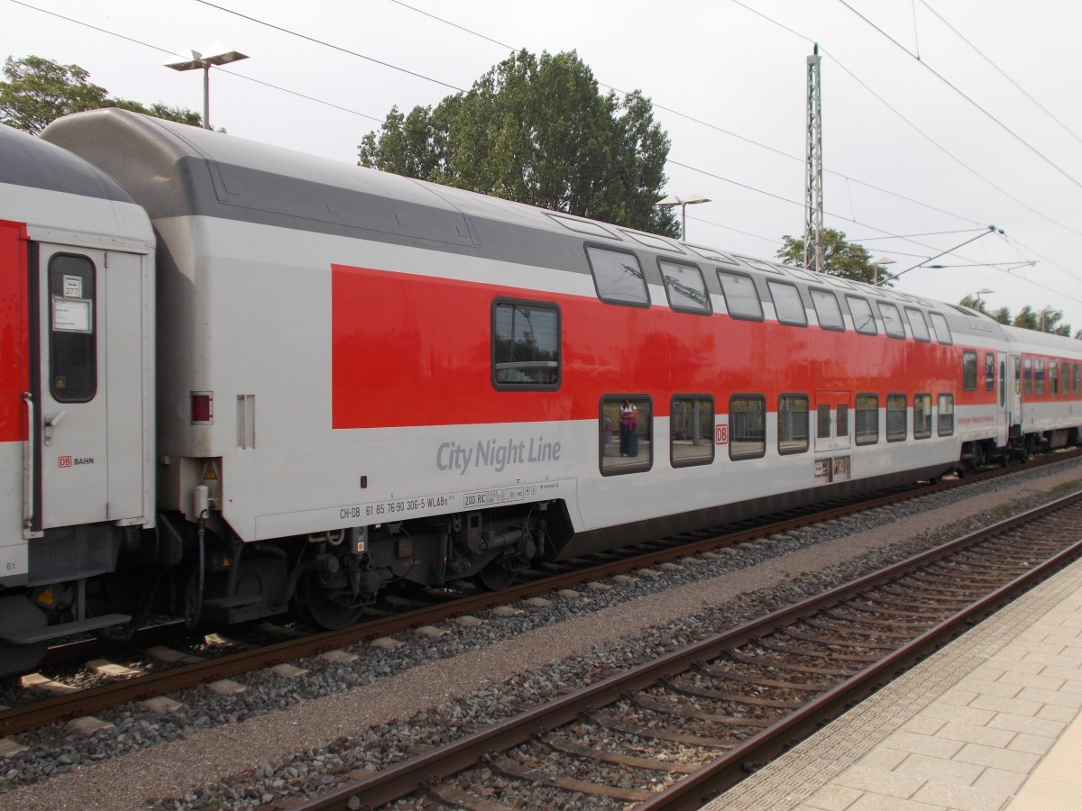 Während die Jahre zuvor der CNL Zürich-Binz-Zürich mit zwei WLABm kam,kommt der Nachtzug in diesem Jahr nur noch mit einem Doppelstockschlafwagen.Aufnahme am 05.Juli 2014 bei der Ankunft aus Zürich in Bergen/Rügen.