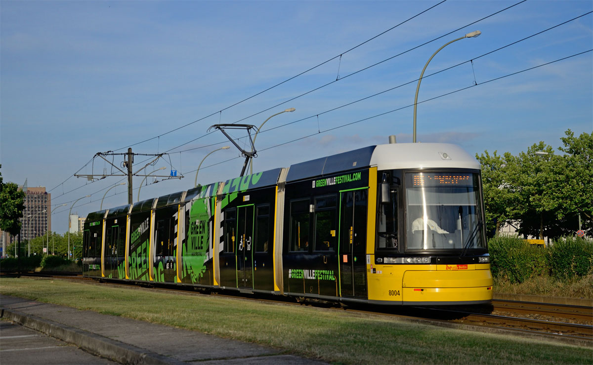 Flexity F8E 8004 mit der neuen Vollwerbung für "Greenville Festival" als Linie M6, Landsberger Allee/Arendsweg 18.06.2014