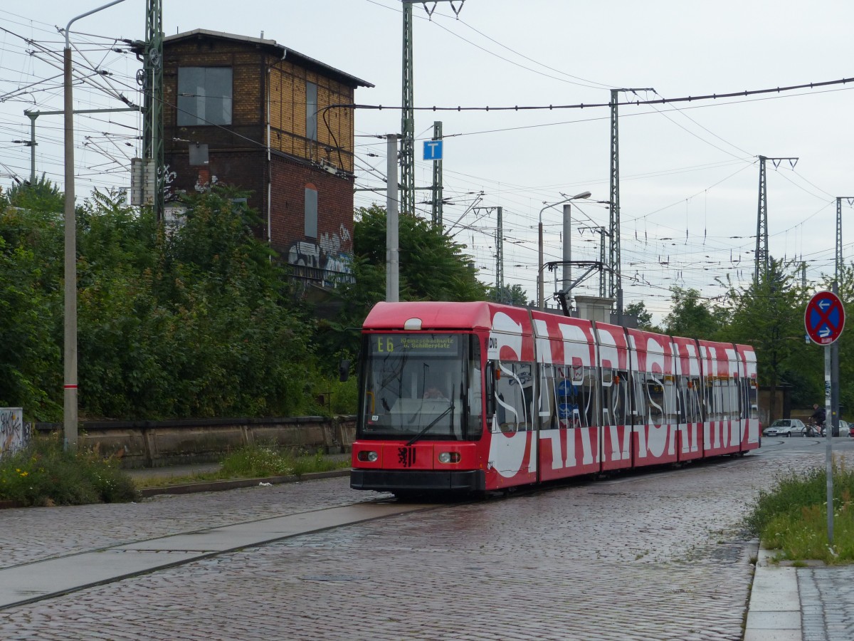 Eisenbahnstraße in Dresden Neustadt: Eine Straßenbahn der Linie E6 macht Pause. 29.6.2014, Dresden