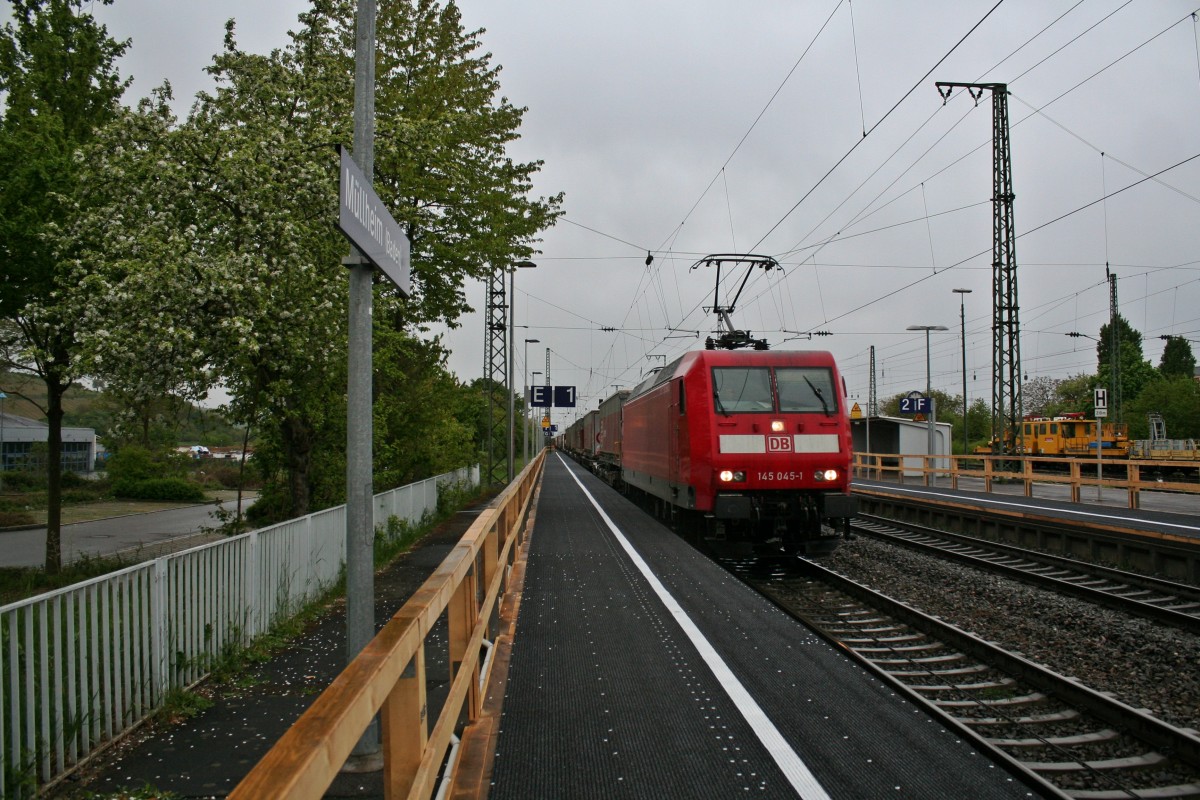 145 045-1 durchfuhr am Morgen des 18.04.14 im strömenden Regen mit einem KLV-Zug aus Basel/Weil am Rhein den Müllheimer Bahnhof in Richtung Norden.