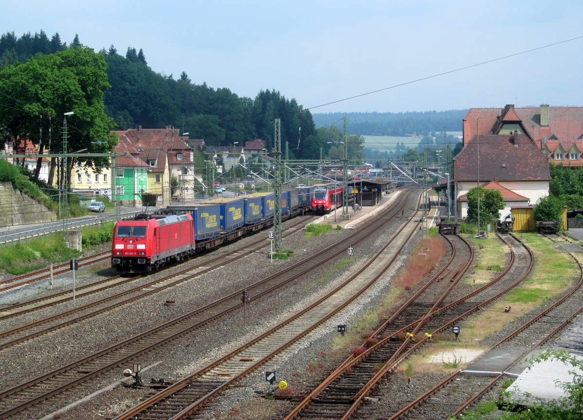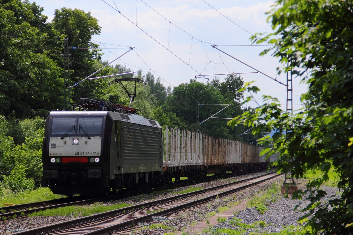 E37 519 zieht am 11. Juni 2014 drei Flachwagen und mehrere H-Wagen durch Kronach in Richtung Lichtenfels.