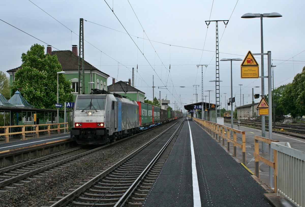 186 101 mit dem DGS 42014 von Melzo nach Wanne-Eickel am Vormittag des 18.04.14 im Bahnhof Müllheim (Baden).