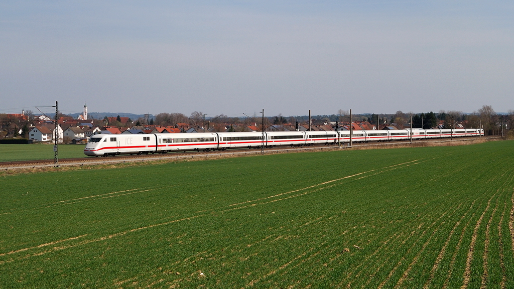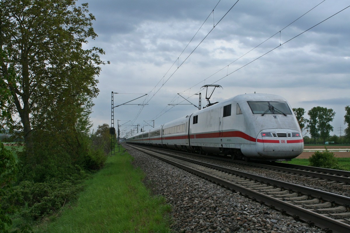 401 585-5 als ICE 77 von Kiel nach Zürich am Abend des 18.04.14 nördlich des Bahnhofs Müllheim (Baden).