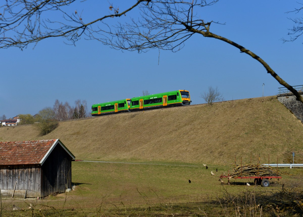 Eine Lok der BR 146 schiebt ihren Dosto-Regionalexpress in Richtung Straubing. Am frühen Morgen des 10.06.2014 befährt der Zug den Vilsviadukt vor der Kulisse der Benediktinerabtei Schweiklberg.