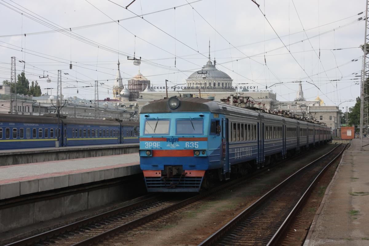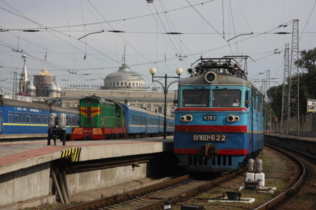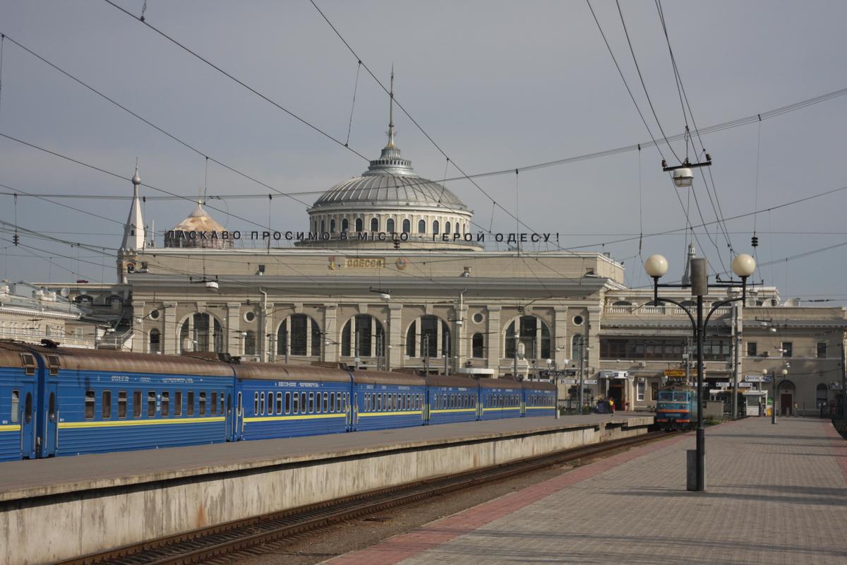 Das imposante Bahnhofsgebäude mit der Rundkuppel macht den Hauptbahnhof von Odessa für mich zu einem der schönsten Bahnhöfe, die ich kenne. In Blickrichtung geht es direkt hinter dem Bahnhof in die Innenstadt von Odessa. Lange Züge mit in der Regel ca. 14 Wagen stehen an den hohen Bahnsteigen. Da es sich um einen Kopfbahnhof handelt, ist ständiger Rangierverkehr zu beobachten. Aufnahme am 2.9.2009.