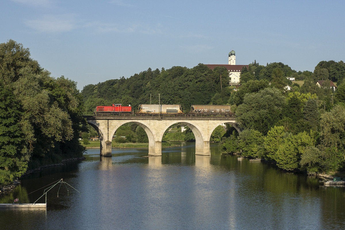 Eine V90 zieht einem kurzen Güterzug zum Bahnhof Vilshofen (Donau). Am Morgen des 10.06.2014 befährt der Zug vor der Kulisse der Benediktinerabtei Schweiklberg den Vilsviadukt.