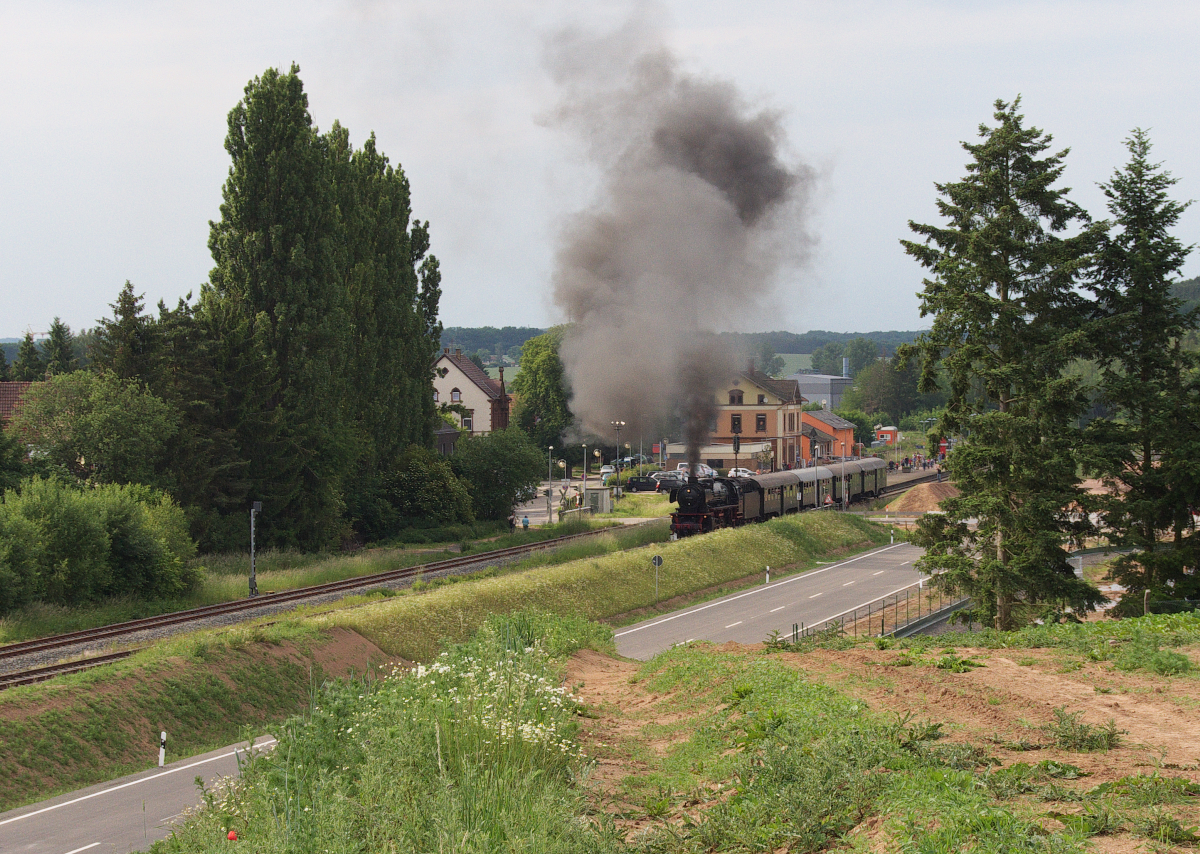 52 8079-7 zieht am 09. Juni 2014 einen Sonderzug nach Marktschorgast aus Neuenmarkt-Wirsberg heraus.