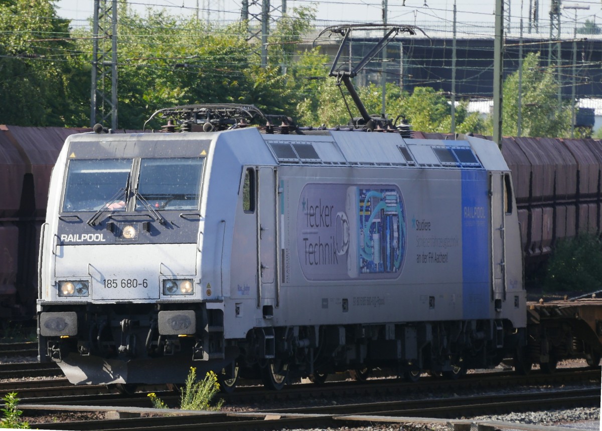 Nach der unwetterbedingten Zwangspause kommt der Betrieb langsam wieder in Gang: 185 680 von Railpool mit lecker-Technik-Beklebung im Gbf Neuss, 12.6.14.
