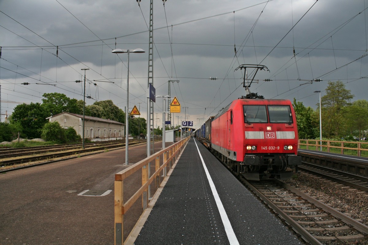 145 032-9 mit einem KLV-Zug auf dem Weg nach Weil am Rhein Rbf am Nachmittag des 25.04.14 in Müllheim (Baden).
