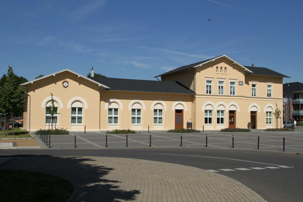 Das frisch Restaurierte Bahnhofsgebäude von Hochneukirch am 06.06.14.