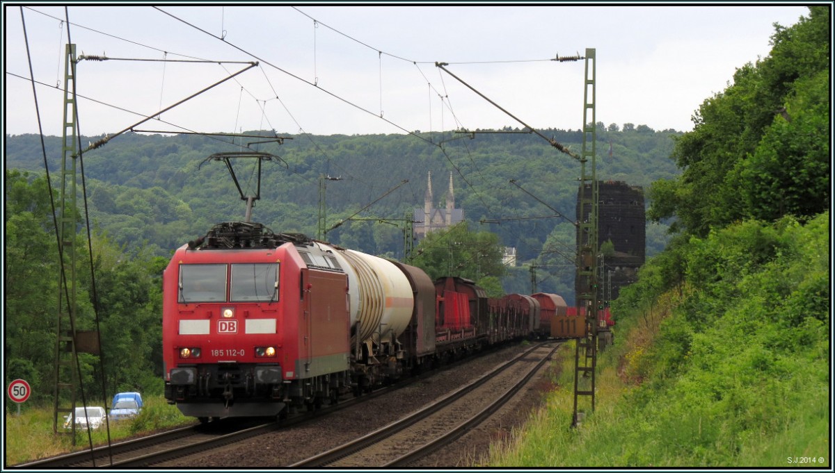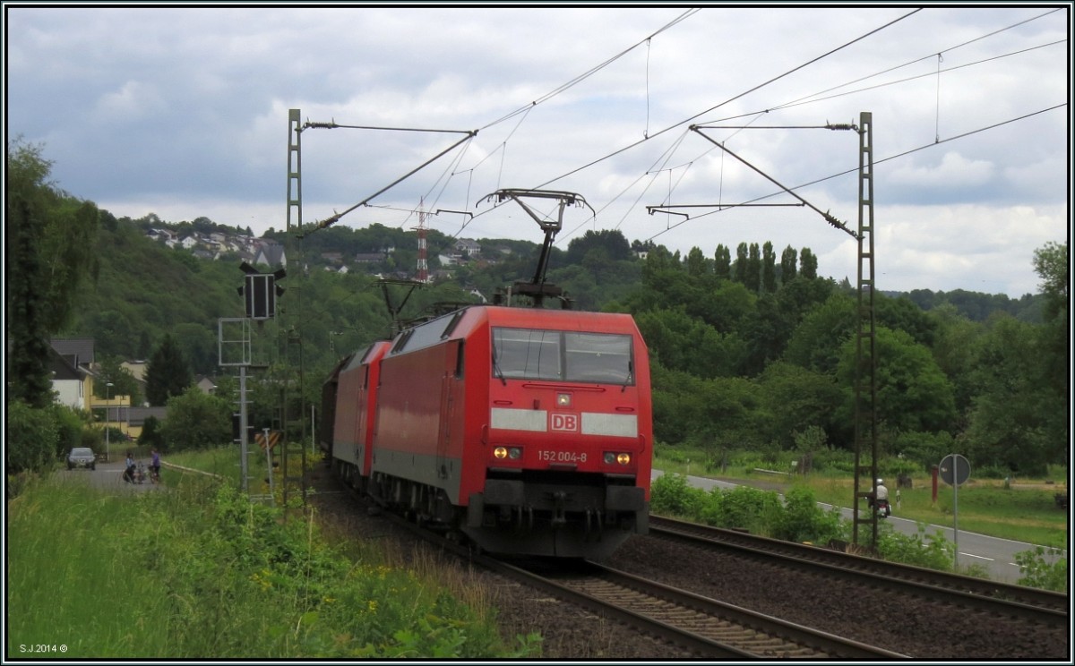 152 096-4 mit einem 155ziger und einigen Güterwagen im Schlepp durch Hirzenach. Sonntag 15.6.2014