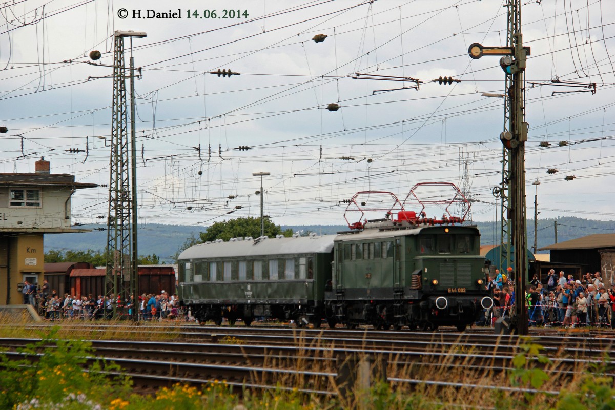 E 60 010 mit einem Gerätehilfswagen bei der Lokparade am 14.06.2014 im DB Museum Koblenz Lützel.