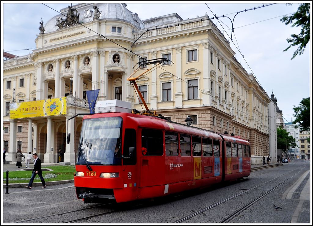Ein Tatra Gelenktram vor dem slowakischen Nationaltheater in Bratislava. (31.05.2014)