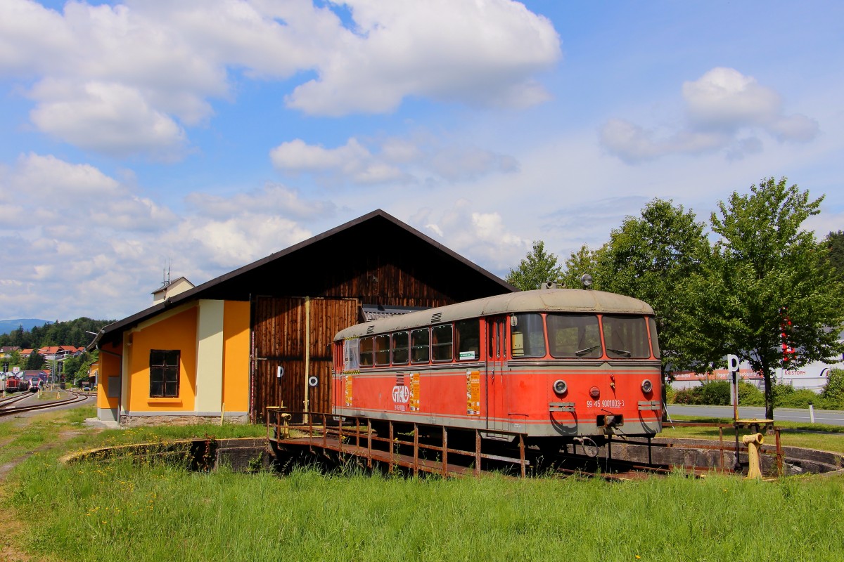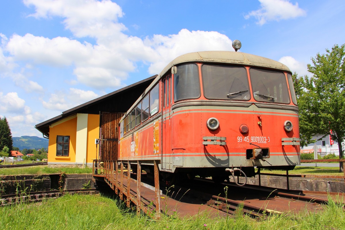 Endlich wieder Tageslicht..... Um VT10.03 vor Vandalen und zu starken Sonnenstrahlen zu schützen verharrt er zumeist im Heizhaus Wies. ZUr Ausstellung der Freunde der Sulmtalbahn in der benachbarten Eishalle werden am 19 Juni auch Briefmarkenfreunde erwartet die Ihre Sammlung präsentieren und der von der Graz Köflacher Eisenbahn aufgearbeitete VT10.02 mit einem Sonderzug. Der leider nicht mehr Fahrtüchtige Ürdinger Schienenbus wartet hier auf der Drehscheibe auf seine Aufarbeitung die allerdings noch ungewiss ist. Wies am 16.Juni 2014