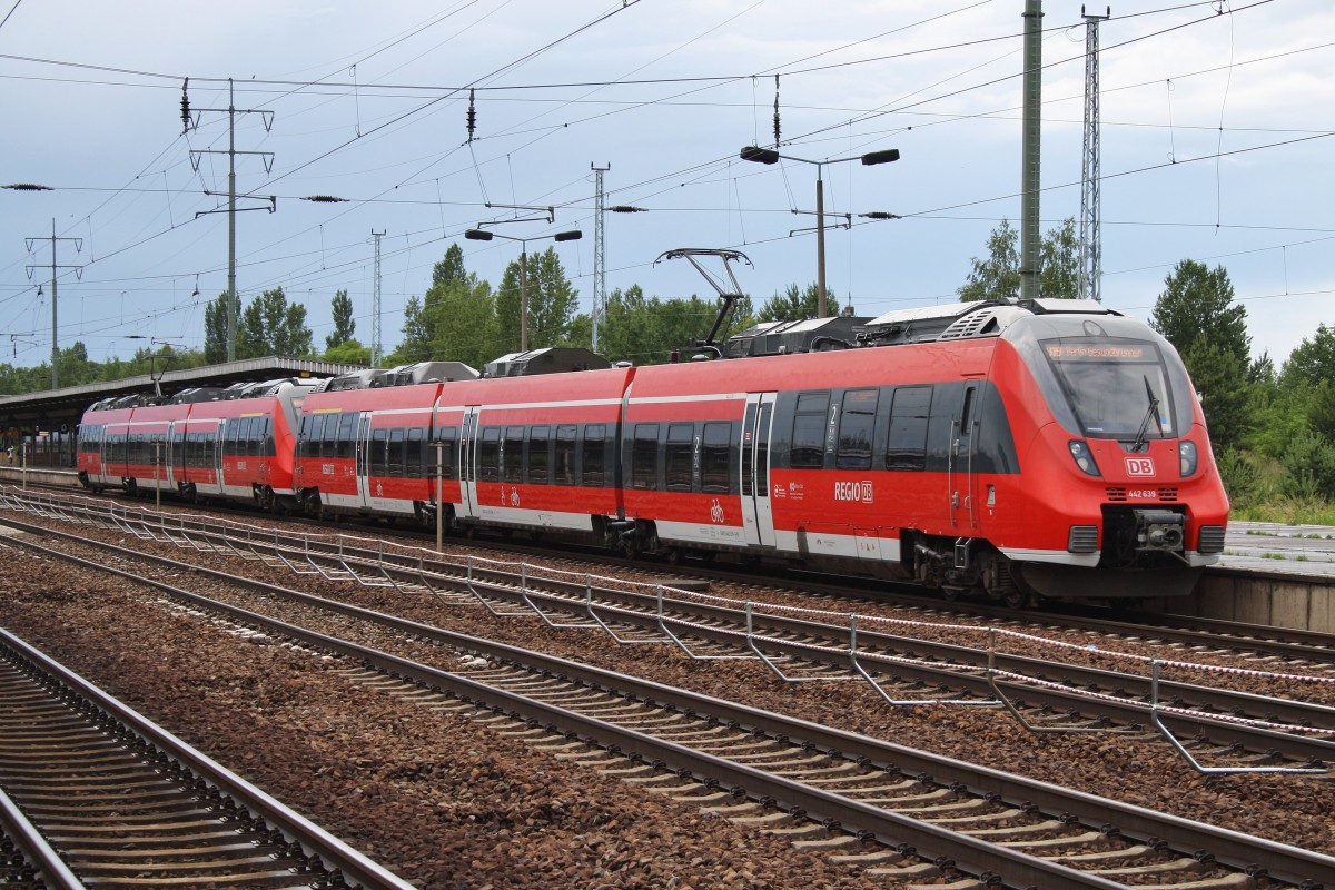 Hier 442 637-5 und 442 139-2 als RB19 (RB18568) "Airport-Express" von Senftenberg nach Berlin Gesundbrunnen, bei der Einfahrt am 14.6.2014 in Berlin Schönefeld Flughafen.