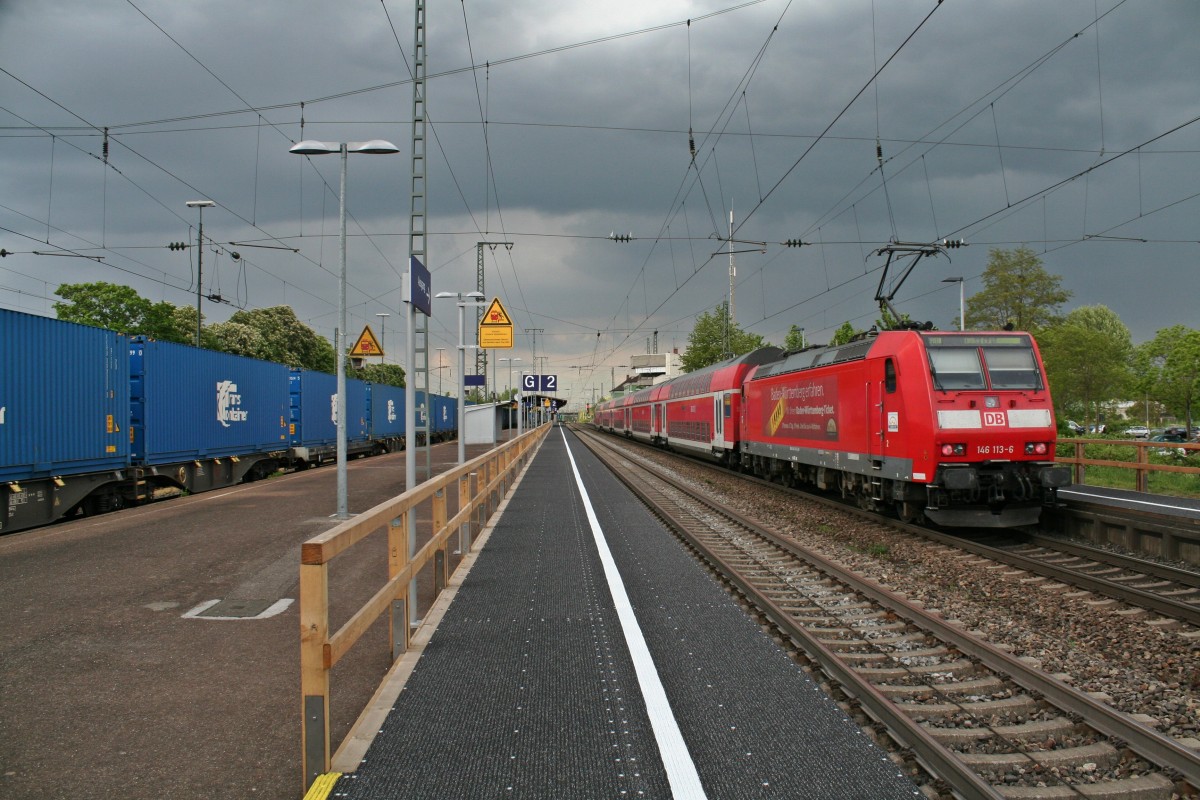 146 114-4 war am 25.04.14 mit einem RE von Schliengen nach Offenburg unterwegs, als sich promt das Fret(t)chen 437023 mit dem 40421 von Bantzenheim nach Malaszewicze im Bahnhof Müllheim (Baden) vordrängelte.