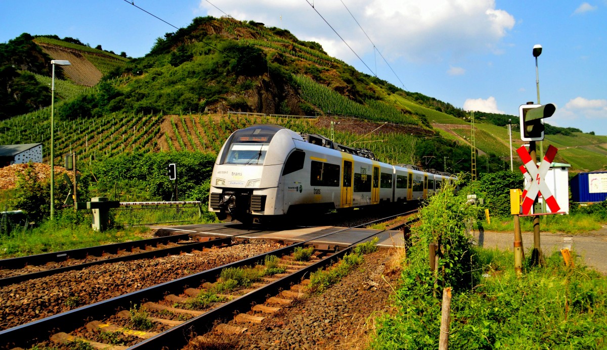 Im Abendlicht kommt der 460 509 der MRB am Bahnübergang Römerweg gen Boppard herangefahren. 2.6.2014