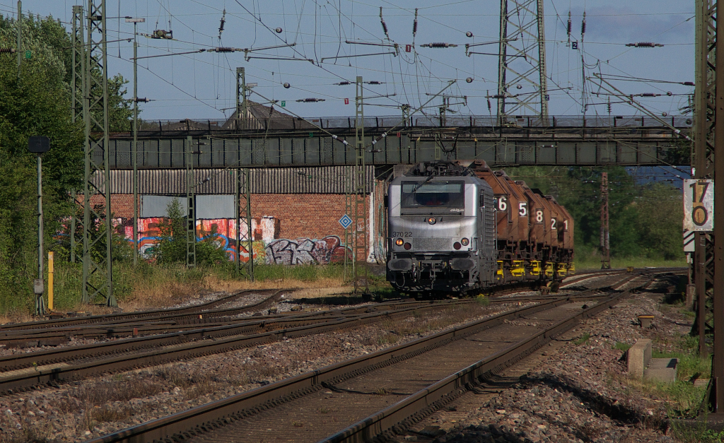 Sonntagmorgen - Das Wetter passte und so ging es nach Bous an die Strecke. In Höhe der alten Bahnmeisterei und des Stahlwerk Bous (früher Mannesmann Röhrenwerke) gibt es einen schönen Platz. Dieser ist etwas breiter, weil der Fahrdraht früher noch ein weiteres Gleis überspannen mußte und die Masten zurück gesetzt stehen. Bei Saarstahl wird rund um die Uhr gearbeitet, egal ob Sonn- oder Feiertag. Daher muß auch der Suppennachschub nach Völklingen rollen. Akiem 37022 ist mit vollen Torpedowagen von Dillingen / Hochofen nach Völklingen unterwegs. 15.06.2014 - Bahnstrecke 3230 Saarbrücken - Karthaus
