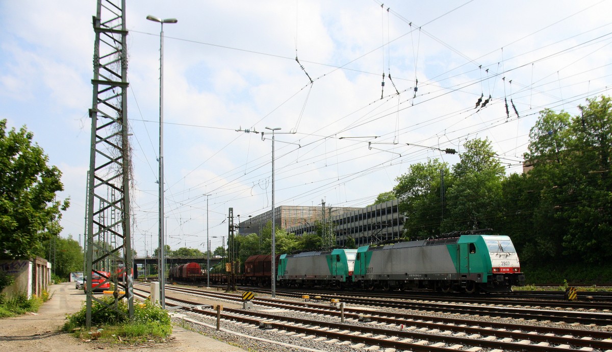 Zwei Cobra 2807 und 2804 kommen aus Richtung Köln,Aachen-Hbf mit einem langen gemischten Güterzug aus Köln-Greberg nach Antwerpen-Noord(B) und fahren in Aachen-West ein bei Schönem Sonnenschein am Nachmittag vom 1.6.2014.