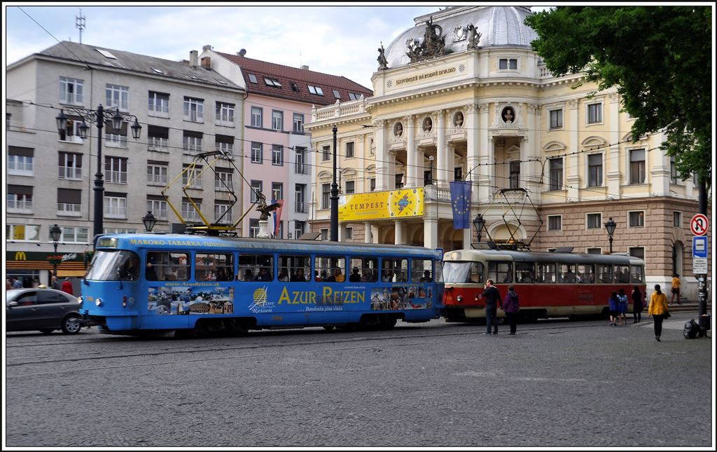 Zwei Tatra Trams vor dem slowakischen Nationaltheater in Bratislava. (31.05.2014)