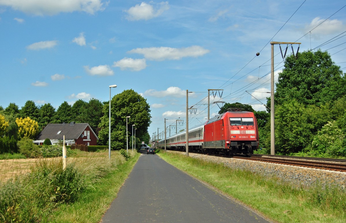 Ausfahrt am 02.05.2014 von der Hamburgerin 101 088-3 mit dem IC 60419 (Duisburg Hbf - Basel SBB)/ CNL 41419 (Amsterdam CS - Zürich HB)/ CNL 479 "Komet" (Hamburg-Altona - Zürich HB) in Basel Bad Bf gen Basel SBB.
