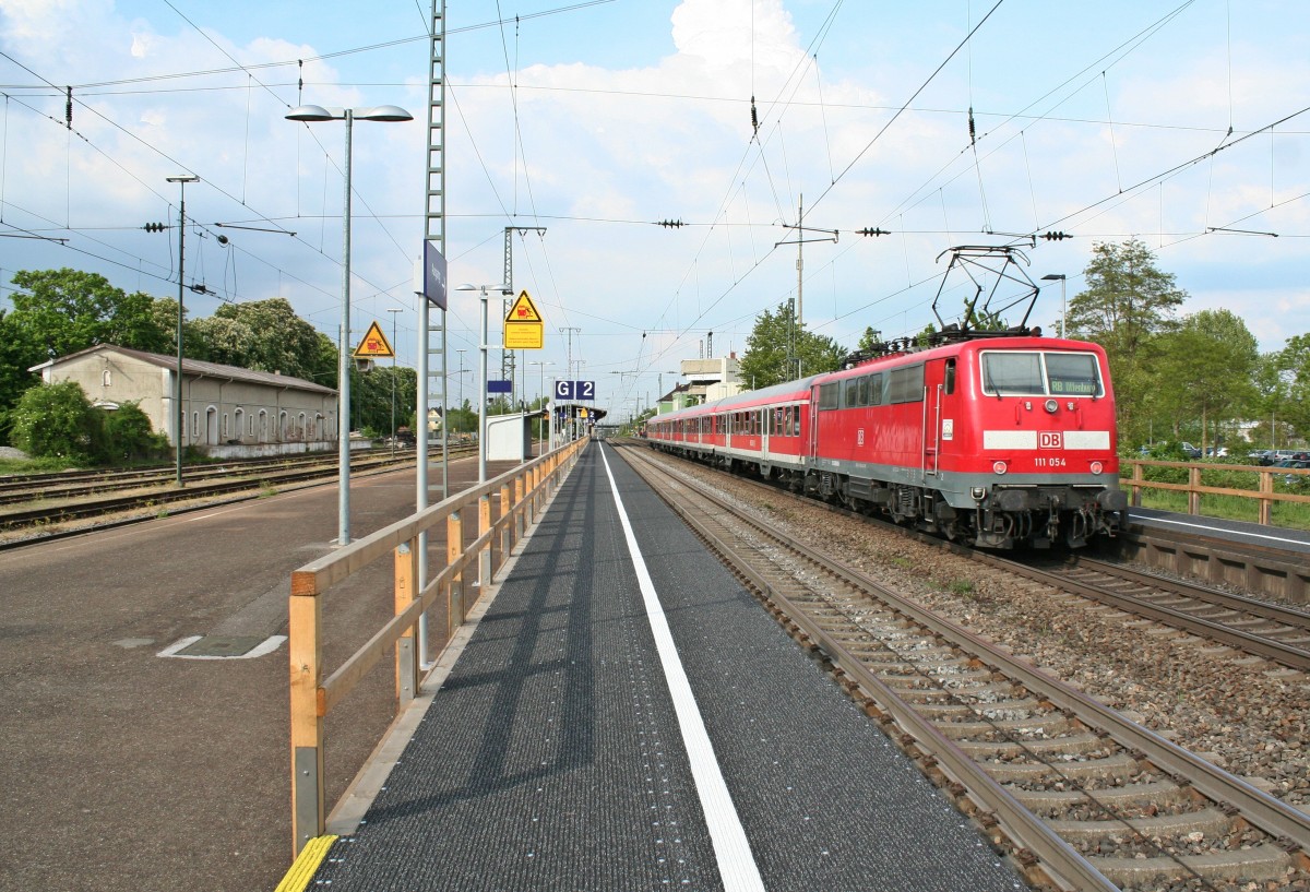 111 054 mit einer RB von Schliengen nach Offenburg am Nachmittag des 25.04.14 bei der Einfahrt in den Bahnhof Müllheim (Baden).