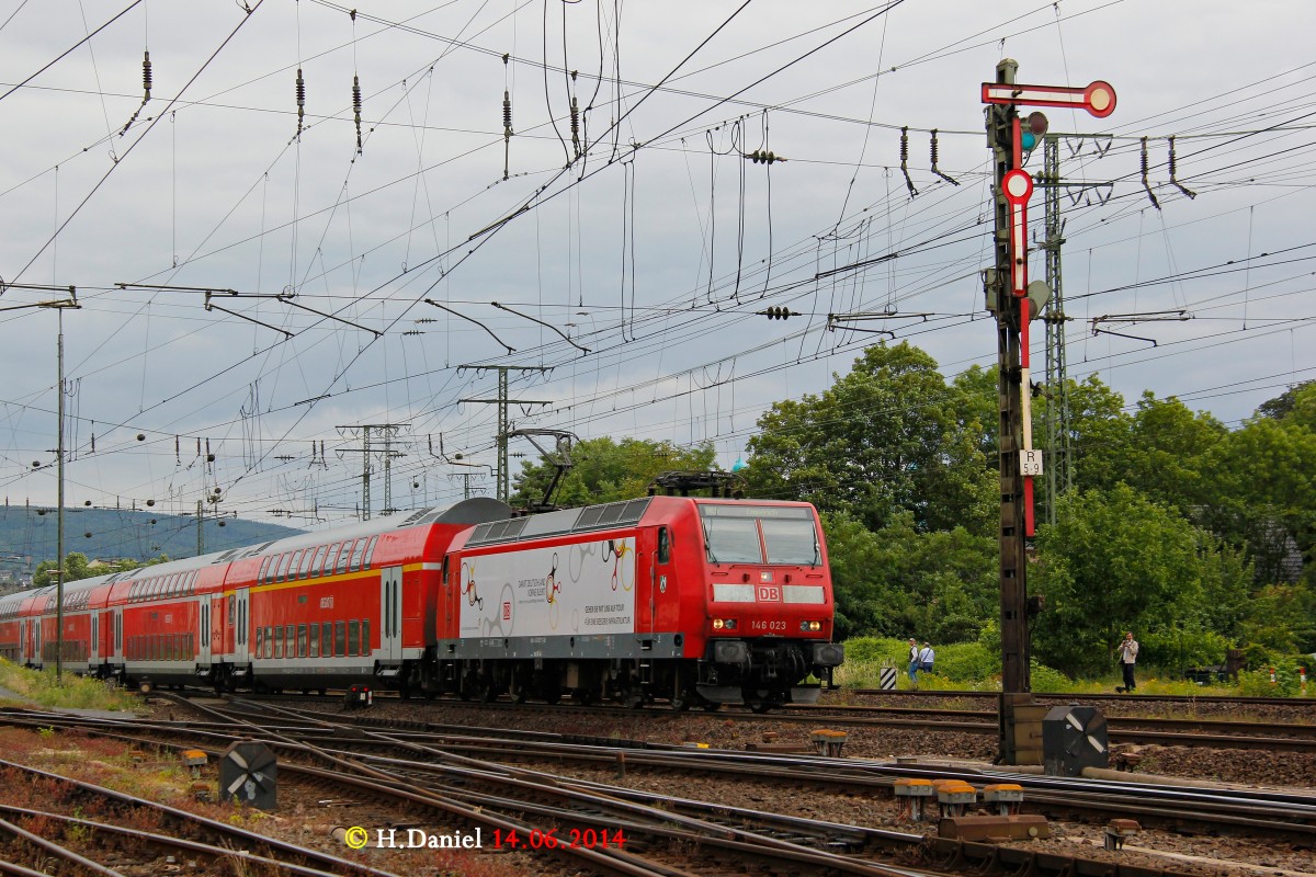Auch eine Einheitslok durfte am 17.6.14 nicht fehlen. So kam der Montags bis Freitags verkehrende Henkelzug mit der 139 287 durch das Maintal gebraust.