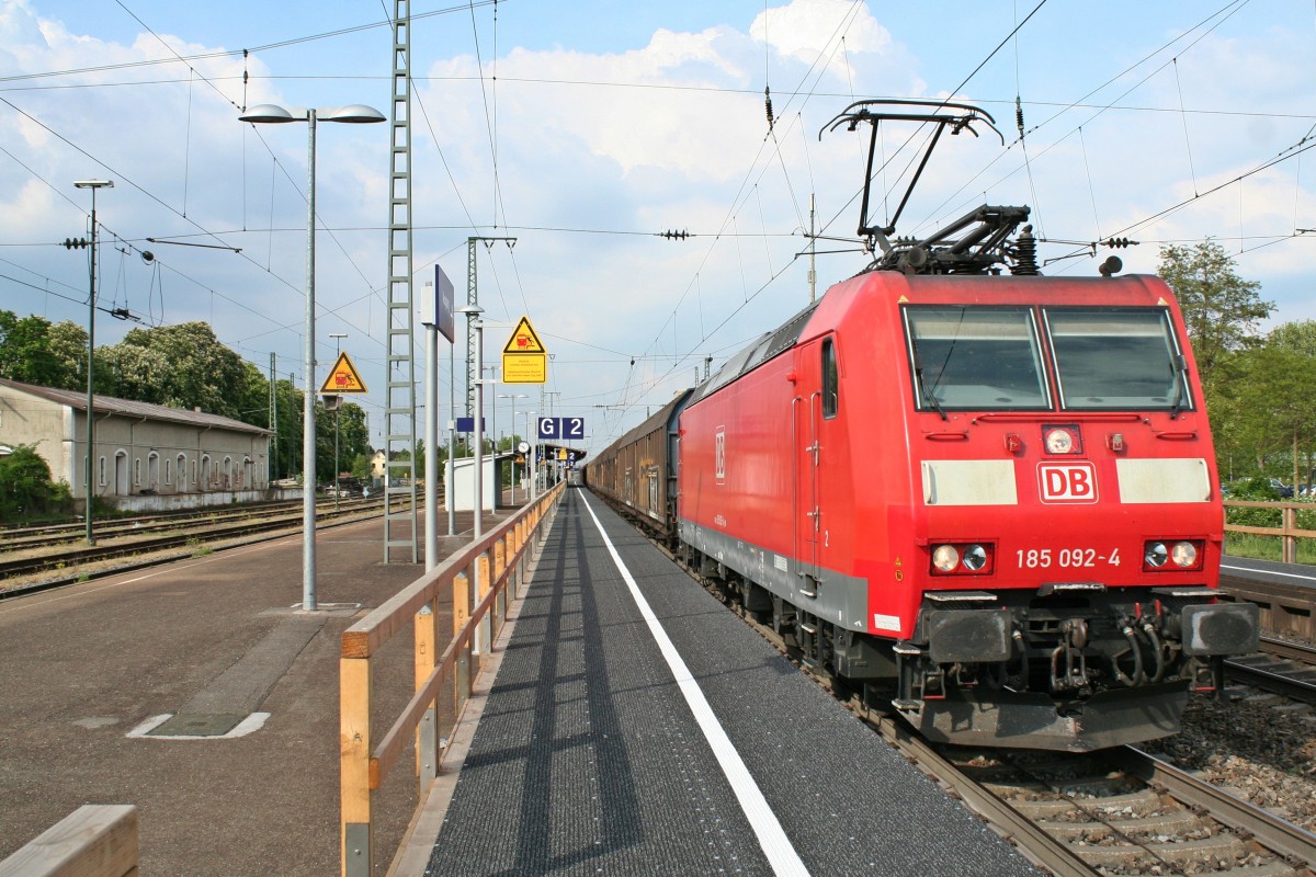 185 092-4 mit einem gemischten Güterzug auf dem Weg nach Basel Rbf/Weil am Rhein am Nachmittag des 25.04.14 im Bahnhof Müllheim (Baden).