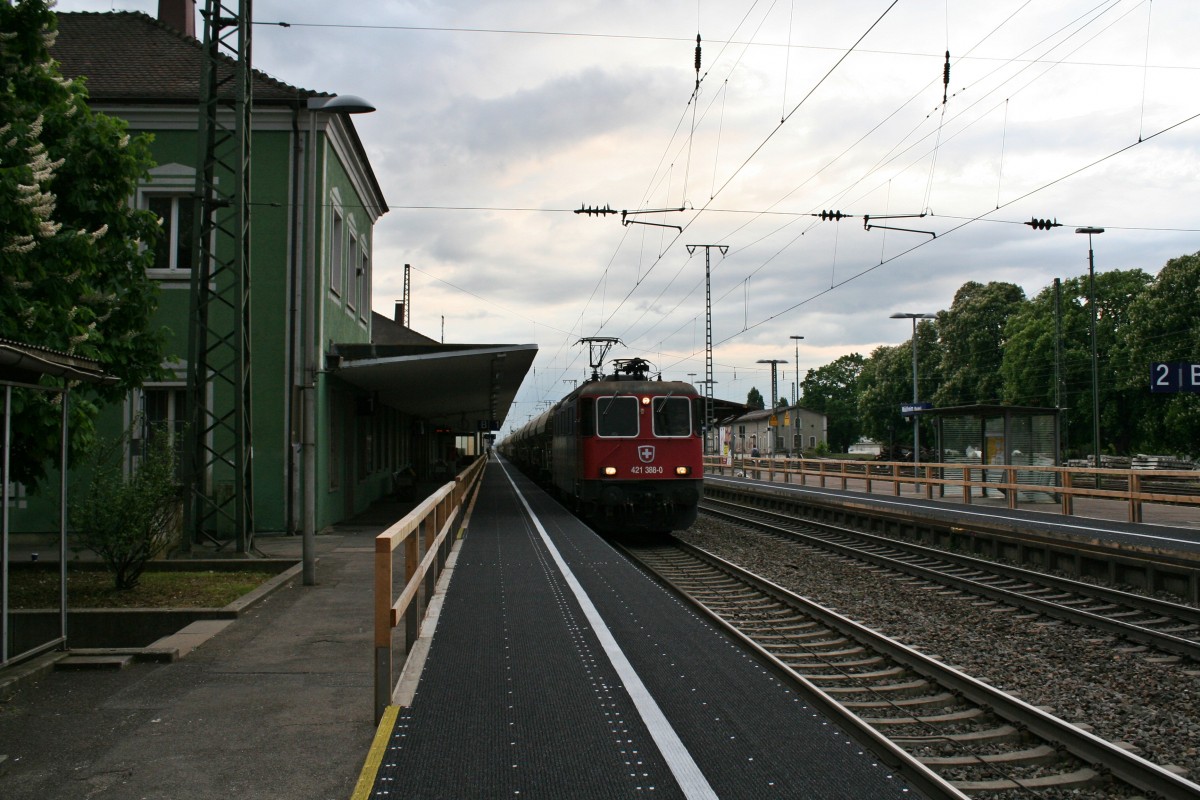 421 388-0 mit einem Schotterzug nach Kehl am Abend des 18.04.14 im Bahnhof Müllheim (Baden).