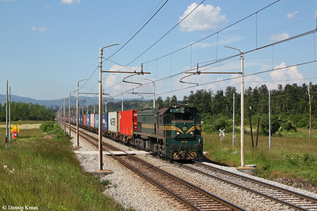 METRANS 761 007 zieht Containerzug durch Cirkovce-Polje Richtung Koper Hafen. /19.6.2014