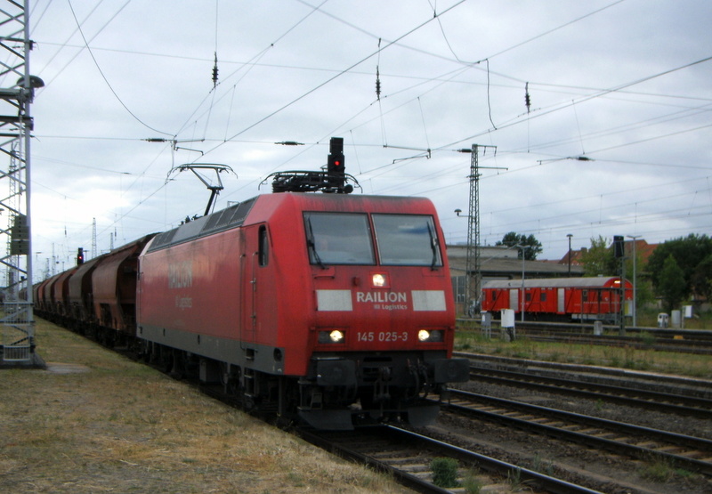 Am 19.06.2014 kam die 145 025-3 von der Railion aus der Richtung Wittenberge nach Stendal und fuhr weiter in Richtung Magdeburg.