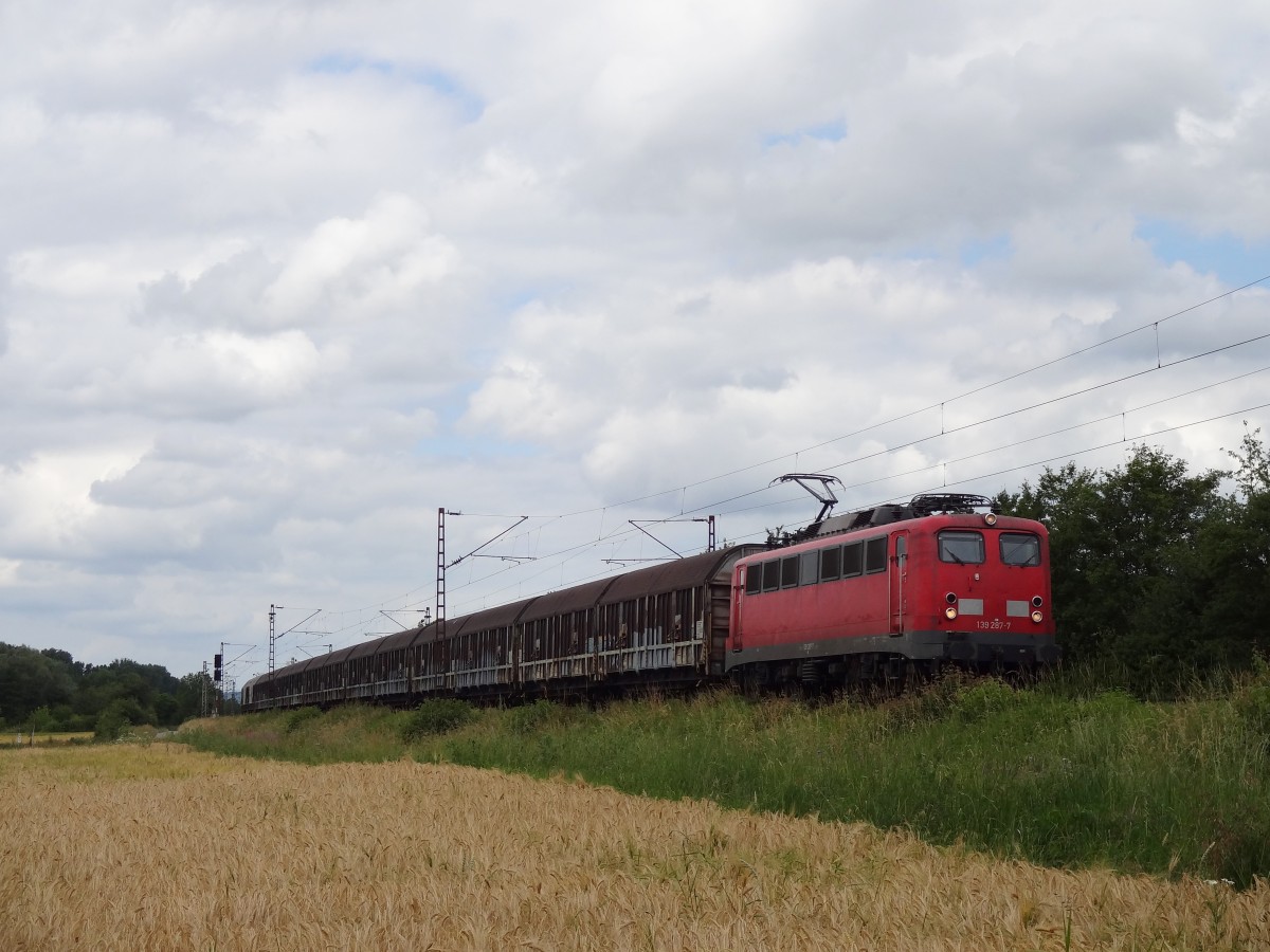 Auch eine Einheitslok durfte am 17.6.14 nicht fehlen. So kam der Montags bis Freitags verkehrende Henkelzug mit der 139 287 durch das Maintal gebraust. Aufgenommen bei Thüngersheim.