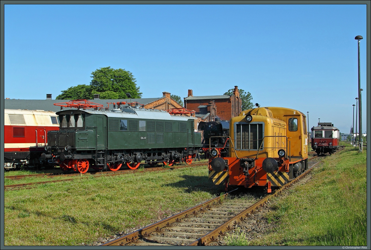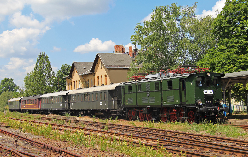 Eine E-Lok in Meuselwitz? Ein Witz, oder? Im Rahmen der Werkstattfahrt 2014 wurde E77 10 mit ihrem Wagenpark extra dort hin geschleppt (bzw.geschoben) um die Fahrgäste, welche vorher mit der Kohlebahn hierher gebracht worden, wieder abzuholen, 18.06.2014.
