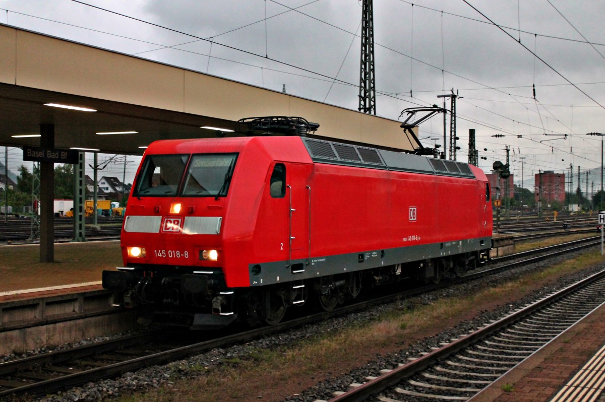 Lokportrait der sauberen 145 018-8 als Lz "Sonderfahrt" durch Basel Bad Bf. Sie brachte zuvor einen Güterzug aus Deutschland in den Schweizer Grenzbahnhof Muttenz und fuhr nun zum Bahnbetriebswerk in Haltingen. (02.05.2014)