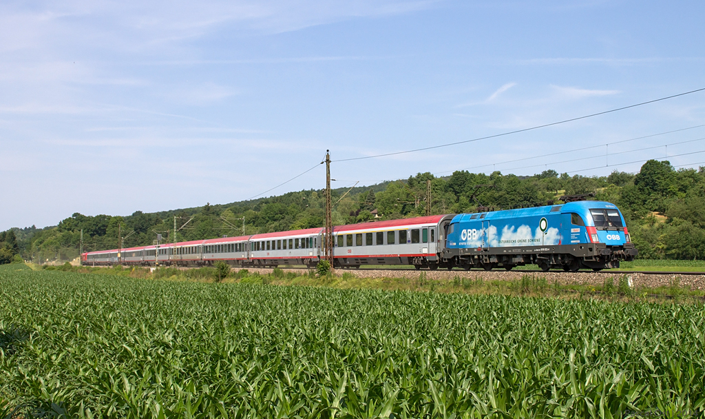 "Österreichs Grüne Schiene" mitten in Baden-Württemberg?! Dieser Gedanke könnte einem jedenfalls bei diesem Foto von 1016 023 "Kyoto Express" vom 19. Juni 2014 kommen; denn so steht es auf der blauen Lok, die an diesem Tag EC 113 von Stuttgart nach München zog. Der Auslöser wurde hierfür bei Ebersbach betätigt.