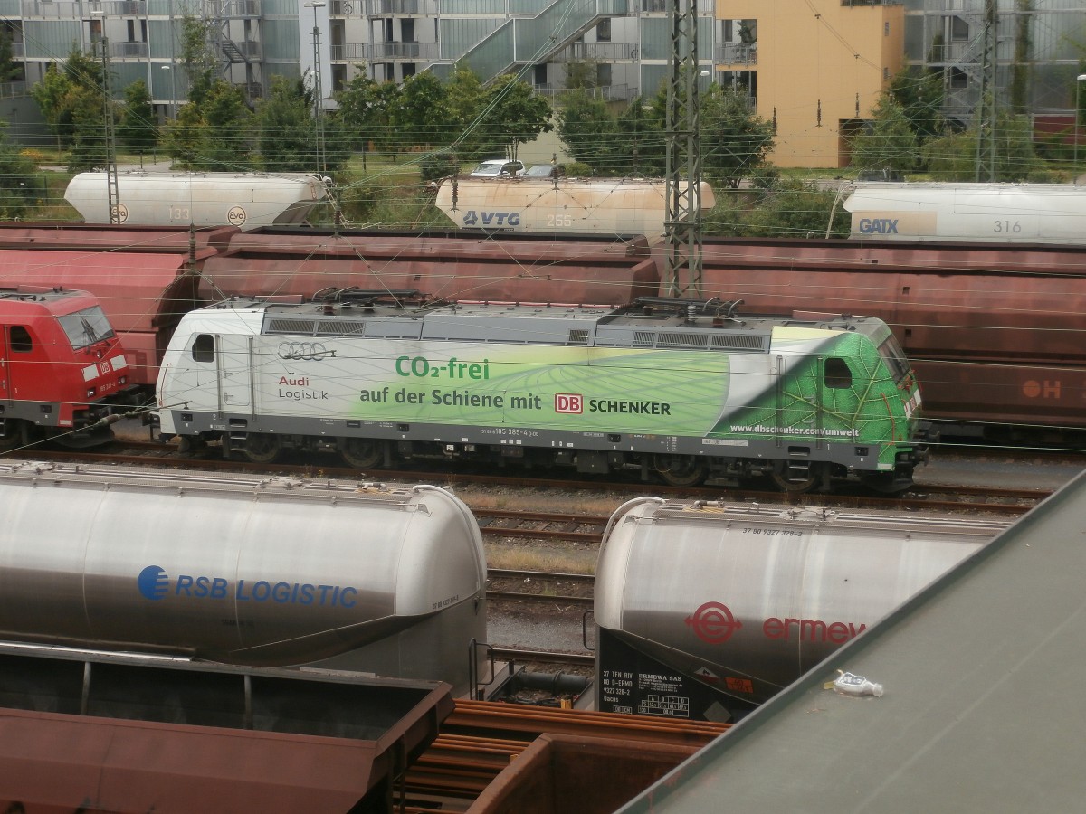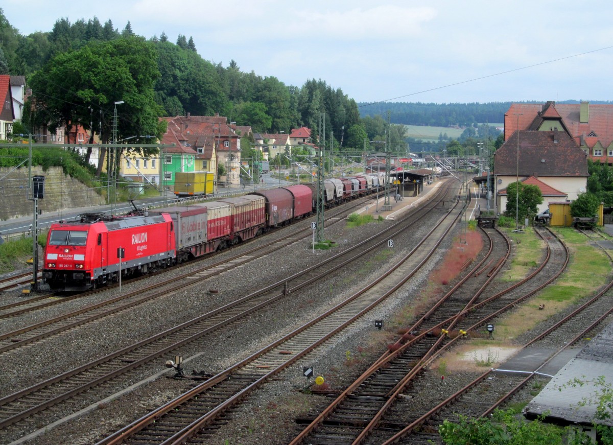 185 287-0 verlässt am 17. Juni 2014 mit einem gemischten Güterzug den Bahnhof Kronach in Richtung Lichtenfels.