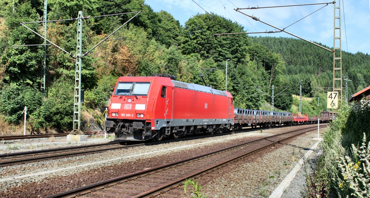 185 385-2 ist am 23.07.13 mit einem gemischten Güterzug auf der Frankenwaldbahn in Richtung Süden unterwegs und passiert gleich Ludwigsstadt.