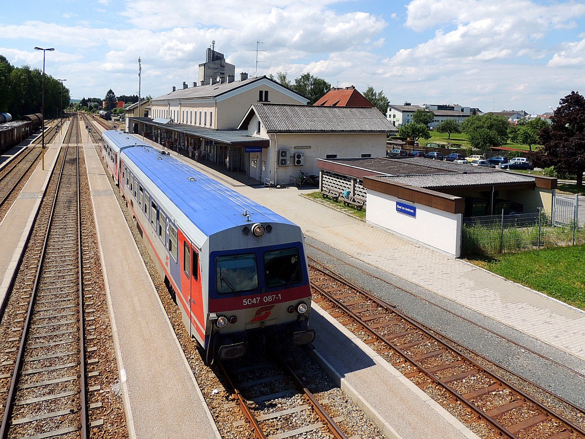 5047 087-1, verlässt mit 083-0 im Schlepptau, als R5993 den Bhf. der Bezirks- u. Schulstadt Ried; 140616